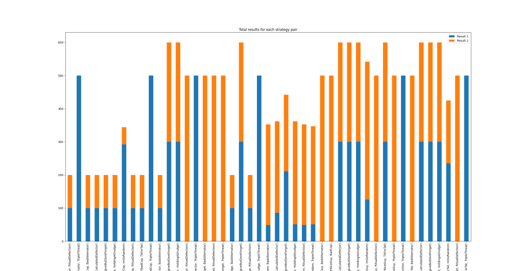 Simulating and researching the prisoner’s dilemma study. Based on algorithmic design of different approaches to the game at hand, scores across 10,000+ games of the Prisoner’s Dilemma will return different results each time the game is simulated.