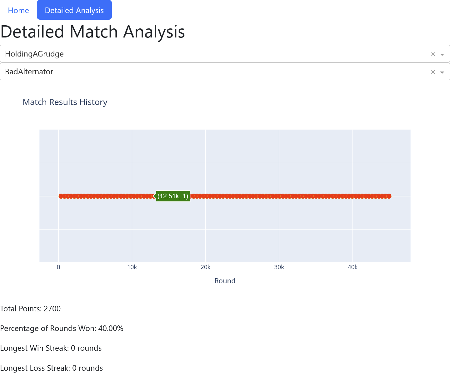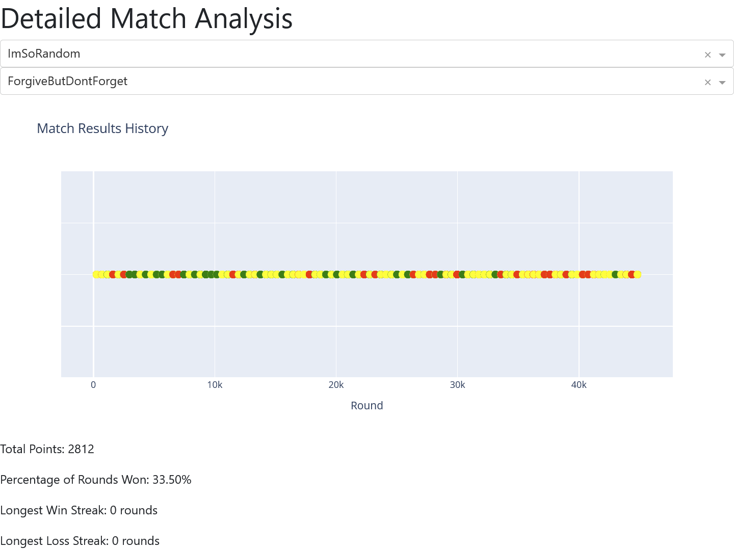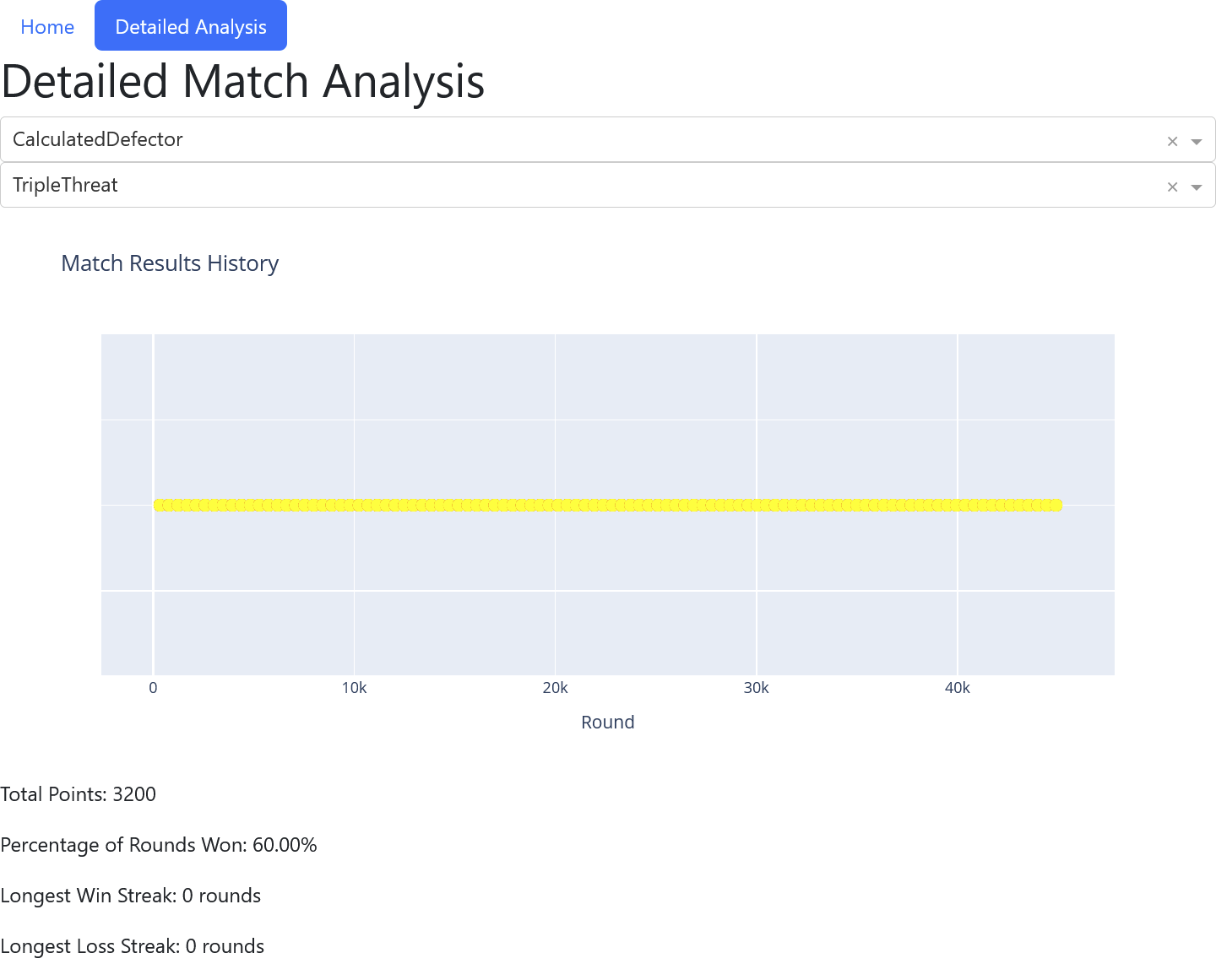 As noted in the project title, “No Two Will Ever Be Exactly Alike.” In simulations involving random noise or probabilistic strategies, the simulation history diverges wildly. A single accidental defection in Round 3 can spiral into a “blood feud” of mutual defection that lasts 100 rounds, completely altering the final scores compared to a simulation where that accident didn’t happen.